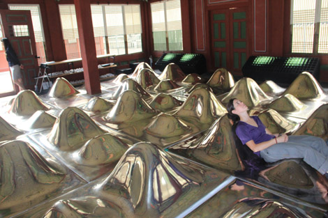 Nous pénétrons ensuite dans le jardin du palais pour aller voir les bâtiments. Nous sommes surpris dans un premier temps par la similitude des architectures des temples entre la Chine et la Corée avant de découvrir que l’influence de la première sur la seconde a été grande durent l’histoire du pays, et que la majorité des temples et palais du pays auront cette forme si particulière, mélangée à celle du Japon, autre pays ayant eu une longue période de domination des terres coréennes. Le palais n’est pas très grand mais comporte plusieurs salles à visiter, et certaines sont, à l’occasion d’un festival d’art moderne, repensées pour créer une nouvelle configuration : nous voici donc vite installés dans des sortes de fauteuils chromés, sortant du sol comme des protubérances, à regarder un plafond antique en écoutant des sons relaxants (je m’endormirai bientôt).