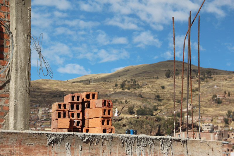 Sur des milliers d’hectares de terre sèche, trois villes retiendront les habitants venus s’installer là comme pour y trouver refuge : Potosi, Sucre et La Paz. Toutes trois imprégnées de leur passé colonial et flamboyantes sous ce ciel bleu limpide de l’Altiplano. Dans le coeur historique de ces villes, les techniques sont à peu près les les mêmes qu’en campagne : murs en briques de terre mais cette fois repeints (signe de richesse relative). Mais les ruelles serrées de l’héritage colonial, vieilles donc délabrées et parfois trop chères ont poussées une majorité des habitants à s’installer en périphérie du coeur historique. Des maisons par milliers poussent comme des champignons, les plus riches vivent en bas et les plus pauvres remontent toujours au plus haut à 4 000 mètres ; cette fois les murs sont en briquettes rouges, probablement un matériau plus simple à utiliser mais à peine plus confortable.