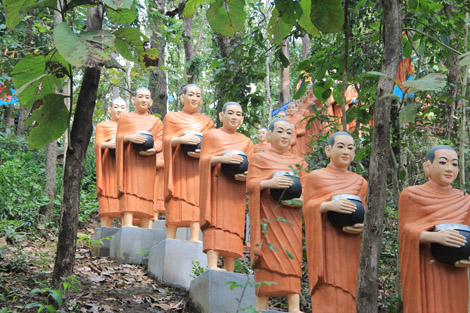 Nous filons ensuite sur huit kilomètres au nord (nous demandons notre chemin chez un habitant pour confirmer notre direction car la route nous a semblé un peu longue) pour rejoindre le centre de méditation du nom de Phnom Sombok. Situé sur une colline, un grand complexe a été construit où sont organisés – je crois – quelques séjours, même aux étrangers comme nous, pour apprendre à méditer. Pour y arriver, il faudra d’abord grimper. Un long escalier mène au premier temple, surveillé par des dizaines et des dizaines de statues de bonzes.  Les principaux occupant à l’heure où nous nous y rendrons seront deux moines très âgés, dont un en train de subir sa toilette (il est assis sur une chaise en plastique, habillé avec sa « robe » orange, en train de recevoir deux à trois grosses bassines remplies d’eau). Nous les laissons tranquille pour grimper un escalier de plus et découvrir le second temple, puis le troisième. Il y a une jolie vue sur le Mékong et sur la campagne environnante. La région de Kratie nous semble très rurale et plate. Les habitants vivent essentiellement de la pêche et de la culture de riz.