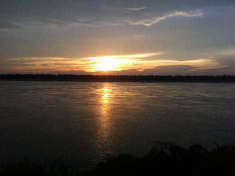 Nous profitons le premier soir du, cette fois je cite en accord total avec mon guide : « le plus beau coucher de soleil du Cambodge » ! Les mots sont forts mais il a raison. Nous n’étions tellement pas préparés à un si beau spectacle que nous n’avions aucun bon appareil électronique pour immortaliser la scène. Nous nous asseyons donc sur un banc à observer en amoureux le paysage : le Mékong est devant nous et le soleil coule derrière lui. Rappelle toi Fabien, ce beau coucher de soleil au Mékong il y a deux ans ? La boucle est bouclée. C’est non sans émotion que nous passerons deux jours sur les rives de ce fleuve, mais cette fois, un peu plus haut et… dans un autre pays surtout. Nous réussirons à prendre une photo, plutôt pas terrible en comparaison du spectacle, histoire de quand même rapporter un petit souvenir.